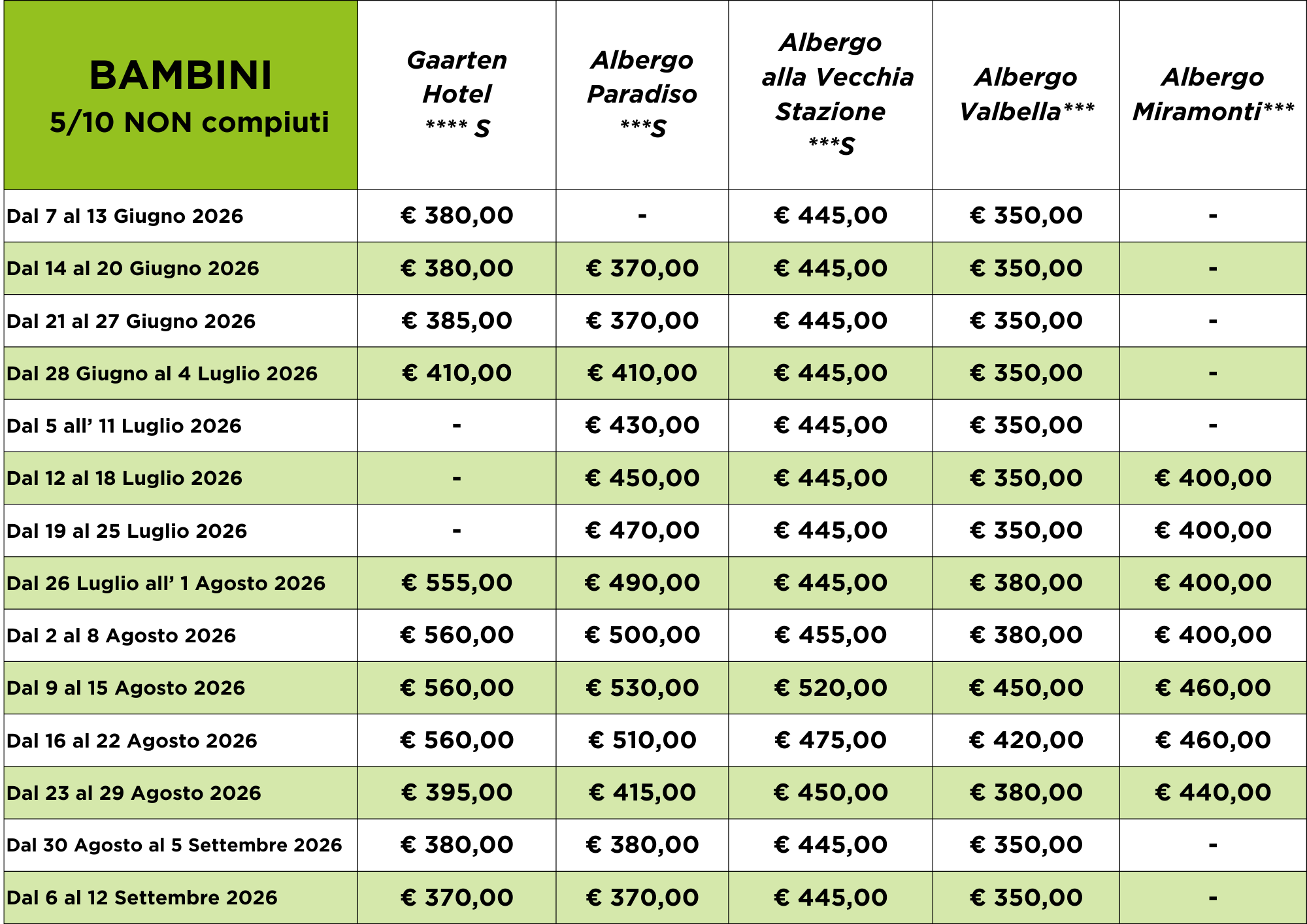 Tutti i prezzi si intendono per persona e comprendono alloggio in hotel con trattamento di pensione completa, attività in montagna e assistenza qualificata.