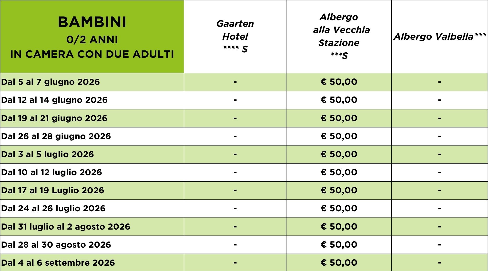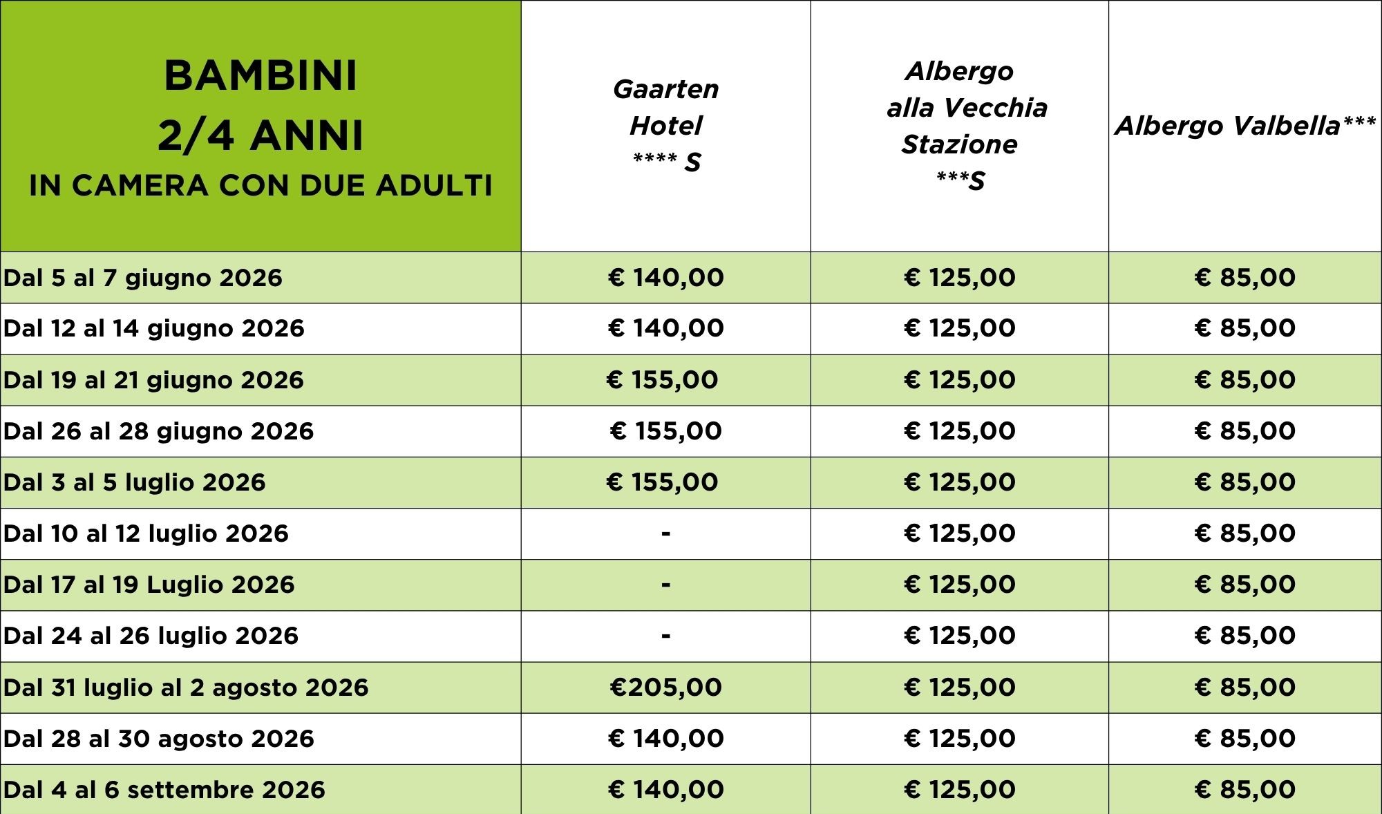 Per usufruire dei prezzi bambini indicati nelle tabelle è necessario che siano in camera con due adulti.