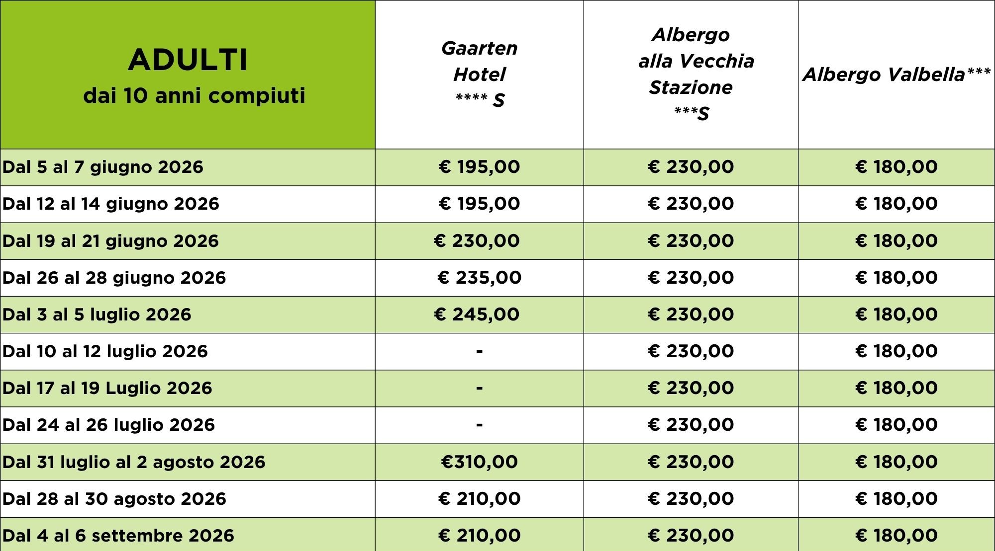 Le settimane o i weekend Asiagoestate sono suddivise in periodi fissi e non modificabili. Tutti i prezzi si intendono per persona e comprendono alloggio in hotel con trattamento di pensione completa, attività in montagna e assistenza qualificata.